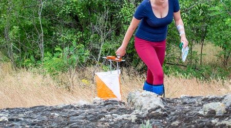 Azerbaijan, Ismayilli 26.08.2016: Outdoor orienteering check point activity . line at an orienteering . Check point Prism and composter for orienteering. Navigation equipment. Woman play Orienteering