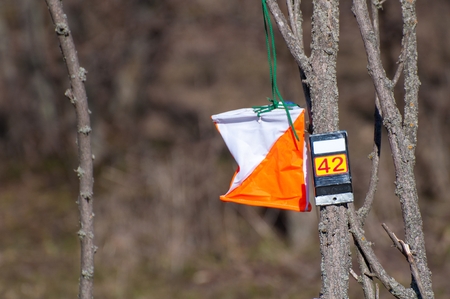 Orienteering. Check point Prism and composter for orienteering. The athlete marks the passage of the control point. Orienteering race