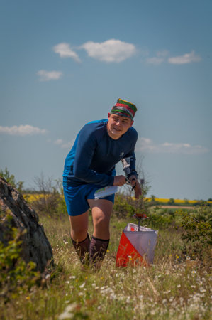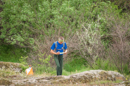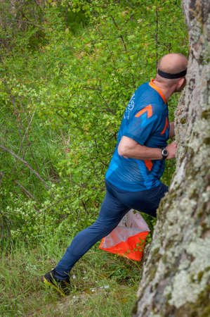 Village Aktovo, Ukraine - May 21, 2021: Orienteering race. Traditional annual game. Athlete during orienteering, checkpoint