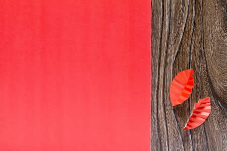 Autumn leaves background of colorful origami paper leaves. Brown wood background. Top view .