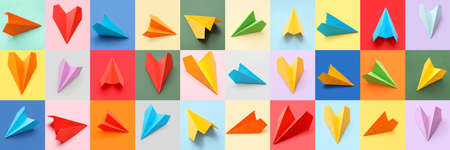banner two groups of four paper origami pigeons red, blue, yellow and white on light background