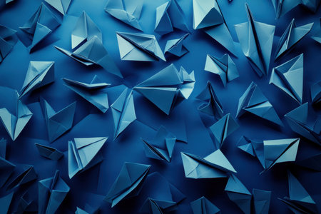 A creative arrangement showcases numerous blue paper airplanes scattered against a deep blue background.