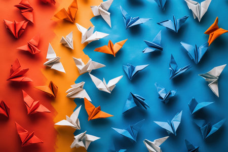 Butterflies made from paper in various colors are beautifully arranged on a colorful backdrop of blue and orange.