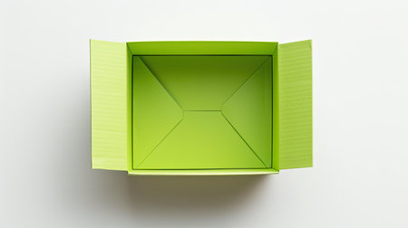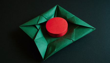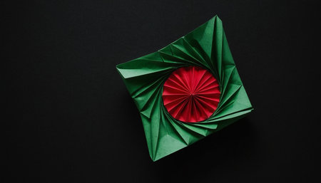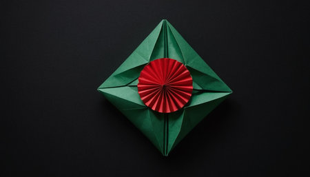 A geometric origami piece is centrally placed on a dark, black surface. The main structure is formed from green paper, folded into a diamond shape with distinct angular points. A vibrant red, pleated circular is positioned at the very center of the diamond. The is shot from a top-down perspective, emphasizing the symmetry and the precise folds of the paper The contrast between the green, red, and black creates a visually striking and clean aesthetic.