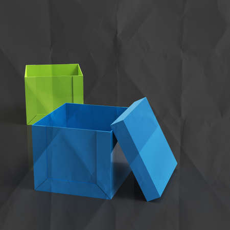 This image showcases an artistic arrangement of colorful empty square paper boxes in shades of blue and green, set against a dark background, perfect for design and craft projects.