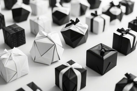 A group of black and white boxes with bows are neatly arranged in a pattern, Geometric shaped gift boxes in black and white for a modern look, AI Generated