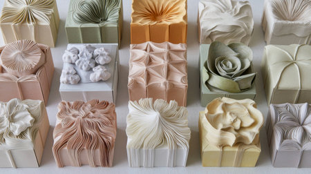 A stunning array of decorative boxes featuring intricate textures and soft color palettes. Perfect for art, gift, or stylish home decor accents.