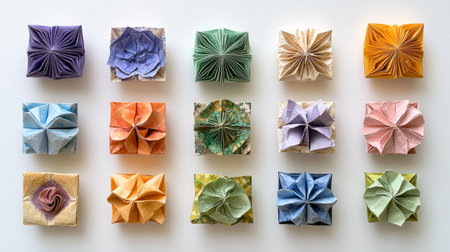 Explore a stunning collection of colorful origami paper designs arranged in a grid, highlighting intricate patterns and textures perfect for art and craft projects.
