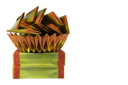 A beautifully wrapped gift box featuring a stunning origami crane on top. This artistic presentation combines nature's charm with creativity, perfect for celebrating special moments.
