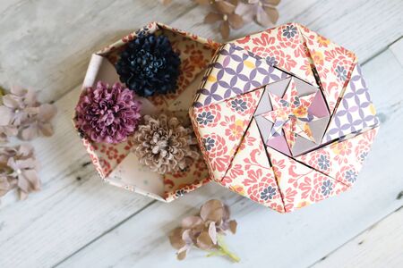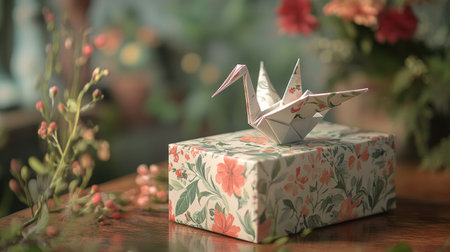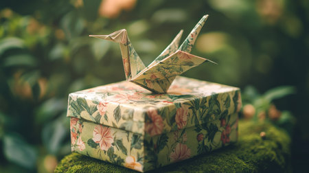 A beautifully crafted paper crane rests elegantly on a decorated floral gift box, surrounded by soft greenery and a serene atmosphere, evoking creativity.