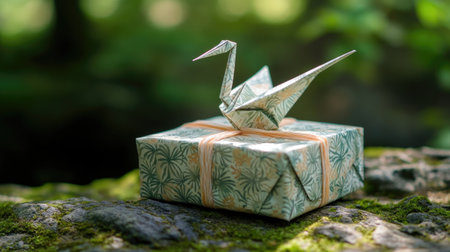 A delicate origami crane elegantly perched on a beautifully wrapped gift box, surrounded by lush greenery, embodying creativity and tranquility in nature.