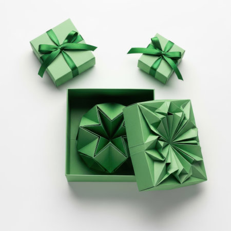 The image features three green origami gift boxes, each adorned with a bow. One of the boxes is open, revealing two intricately folded origami stars inside. The stars are detailed and showcase the artistry of origami. The scene is set against a plain background, highlighting the vibrant green color and the intricate folds of the origami.