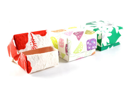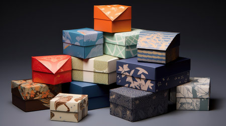 A vibrant arrangement of decorative boxes featuring elaborate patterns on a smooth marble surface, highlighting artistic creativity and exceptional craftsmanship in design.