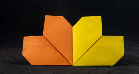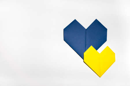 Blue paper heart under smaller yellow paper heart, origami art, on white isolated background. Concept happiness, love.Careful of the heart.