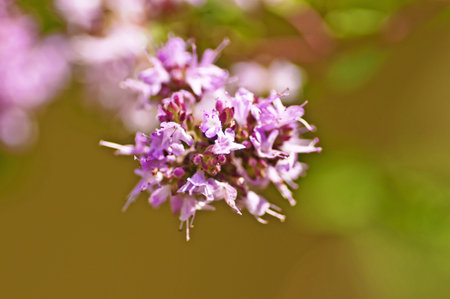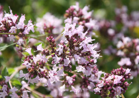 Blossom of oregano or majoram aromatic kitchen herb, nature background