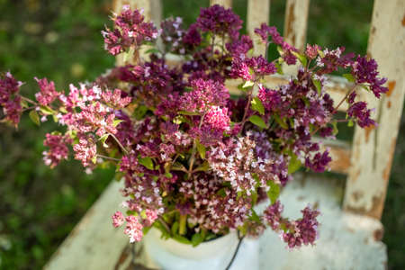 Preparation for drying medicinal herbs - oregano. Alternative medicine is good for your health. Natural nature and rustic style. Purple flowering plants