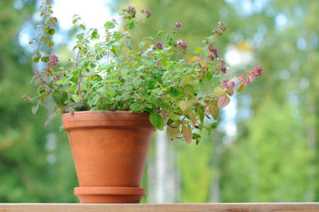 Homegrown and aromatic herb in old clay pot. Set of culinary herb. Green growing oregano.