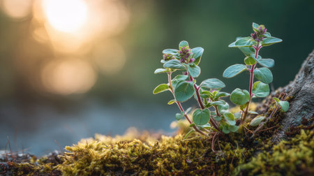 Photo of a small Oregano growing on moss at sunrise, symbolizing hope and new beginnings. Web banner with copy space on the right for product placement.