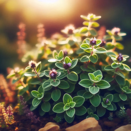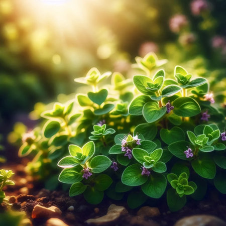 The Oregano in spring, fresh green leaves, soft sunlight filtering, vibrant atmosphere full of vitality, natural textures, serene mood P.
