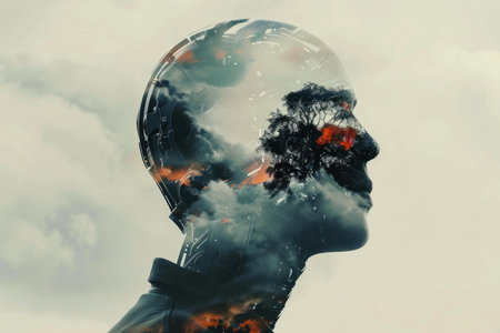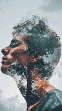 Artistic double exposure image blending a person with nature and industrial elements