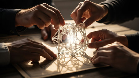 Business people hands working together on glass structure. Concept of teamwork unity and complex problem solving. Architectural model detail.