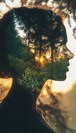 A tranquil forest landscape beautifully merges with a woman s silhouette during a stunning sunset