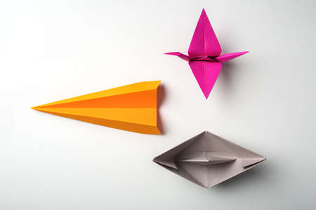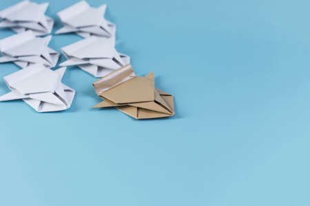 Paper boats of multi-colour. Concept for leadership, teamwork and winning success
