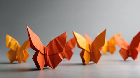 Butterflies made from paper in various colors are beautifully arranged on a colorful backdrop of blue and orange.