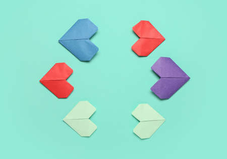 Traditional Japanese origami cranes made of blue and yellow paper on a white background. Pair of colorful paper birds. origami birds.