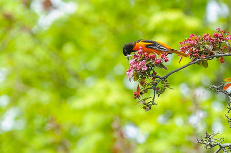 A male Baltimore Oriole building a nest in a Maple tree in the spring