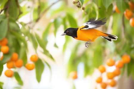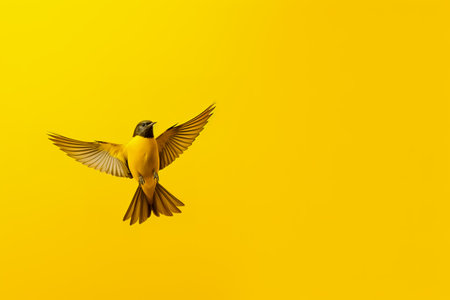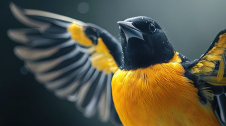 the yellow bird gracefully soars through the air, showcasing its vibrant colors of dark black and orange. this national geographic photo captures the essence of reimagined classical forms, restored and repurposed to create vibrant and airy scenes. the nature-inspired imagery is beautifully captured through a long lens, allowing for a detailed and captivating view of this magnificent bird. ai generated