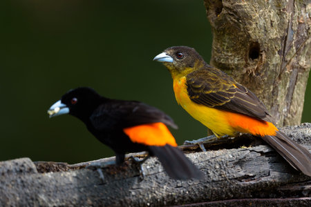 Male and female Black-crested Oriole (Oriental Orioleus melanoleus) perching on a log