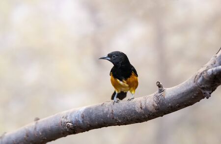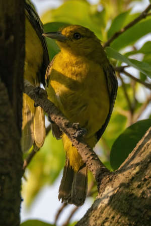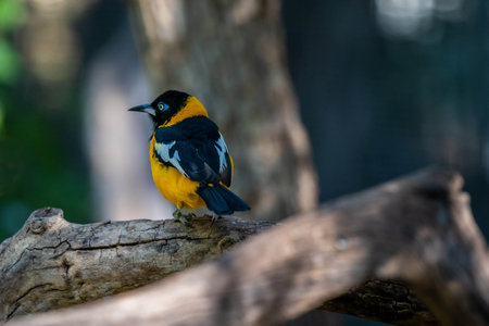 A Yellow Oriole (Icterus nigrogularis) perching on a branch with a blurred background. Bird in garden. Yellow bird. Wildlife in nature.