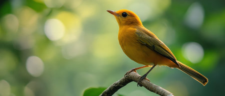 In a serene natural setting a small vibrant yellow bird stands on a thin branch. Its bright plumage contrasts beautifully with the soft bokeh of the lush green foliage in the background. The bird seems alert and lively with its head slightly tilted as if listening to the surrounding sounds of the forest