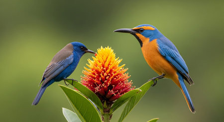 Beautiful male and female Orange-breasted Bee-eater feeding on red flower
