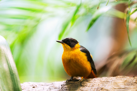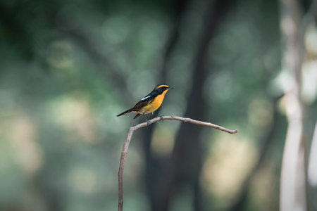 Bird (Narcissus Flycatcher, Ficedula narcissina) male black, orange, orange-yellow color perched on a tree in a nature wild and risk of extinction