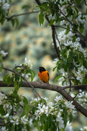 Close up of a Baltimore oriole (Icterus galbula) perched on a tree branch during early spring. Selective focus, background blur and foreground blur.