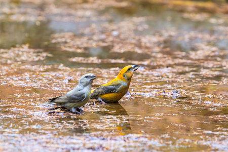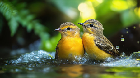 Two yellow birdlings are seen nestled close together in a sparkling creek, surrounded by vibrant greenery, enjoying a serene moment in the warm sunlight of a peaceful afternoon.