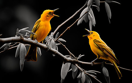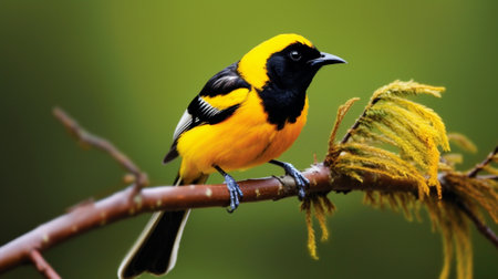 An AI generated illustration of a yellow Baltimore Oriole perched on a green branch
