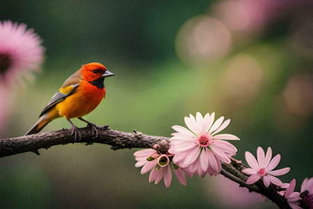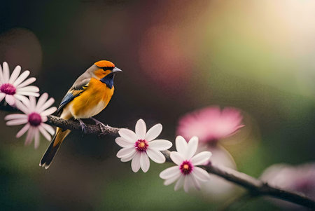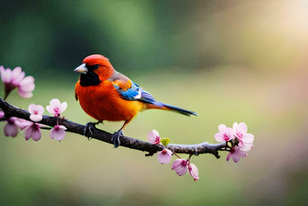 A stunning bird with bright colors sits gracefully on a branch adorned with blooming flowers, perfectly capturing the essence of spring and nature's vibrancy in soft light.