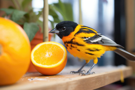 an orange and black bird is captured in a studio portrait-style photograph, with dark yellow and black colors. the softbox lighting enhances the sharp and clever humor portrayed by the bird's strong facial expression. the bold character designs, created using zbrush, make this image truly captivating. ai generated