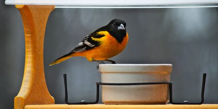 A male Baltimore Oriole in breeding plumage visits a bird feeder in Minnesota. Beautiful vivid orange yellow color makes this bird easy to locate in nature.