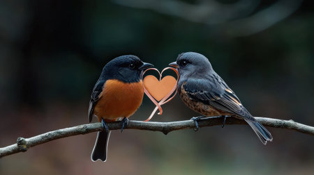 A playful scene of two birds sitting on a branch holding a heart-shaped ribbon together