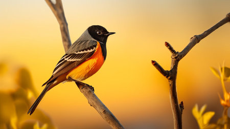 the american redstart, a vibrant warbler species, perches elegantly on a sturdy brown stem, showcasing its striking black and orange plumage against a brilliant, sun-kissed background, highlighting its slender build and long, dark tail, a true marvel of nature's beauty and color. ai generated