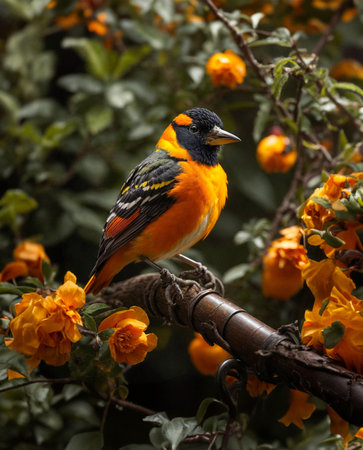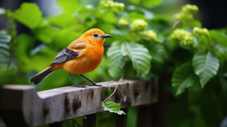the baltimore oriole perches elegantly on a weathered wood branch, its vibrant orange and black plumage standing out against a lush green background, showcasing the beauty of nature in this stunning wildlife photography, highlighting the bird's unique characteristics in a serene forest setting. ai generated