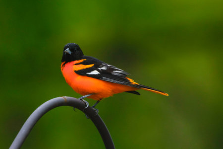 A shallow focus of a Baltimore oriole sitting on a metal arc with a green blurred background