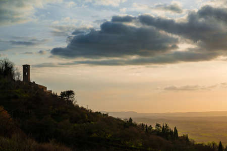 View of the medieval town of Cortona with Val di Chiana Valley in Tuscany at sunset