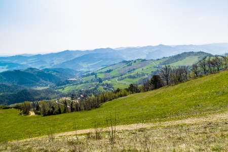 Country landscape in Romagna along the road from Cesena to Sogliano al Rubicone at summer. Vineyards