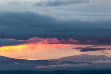 Fiery sunset from the old city of Bergamo to the Po valley. Lombardy, Italy