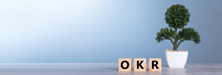 OKR text (Objectives, Key and Results) on wooden cube blocks on blue background for business target and focus concepts
